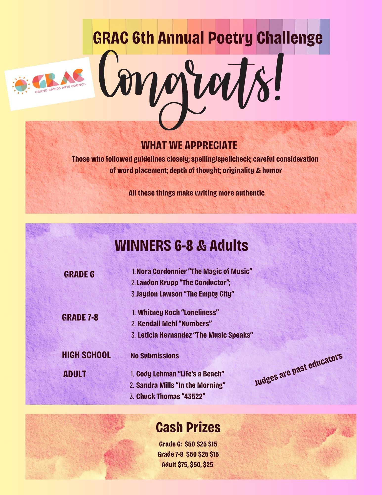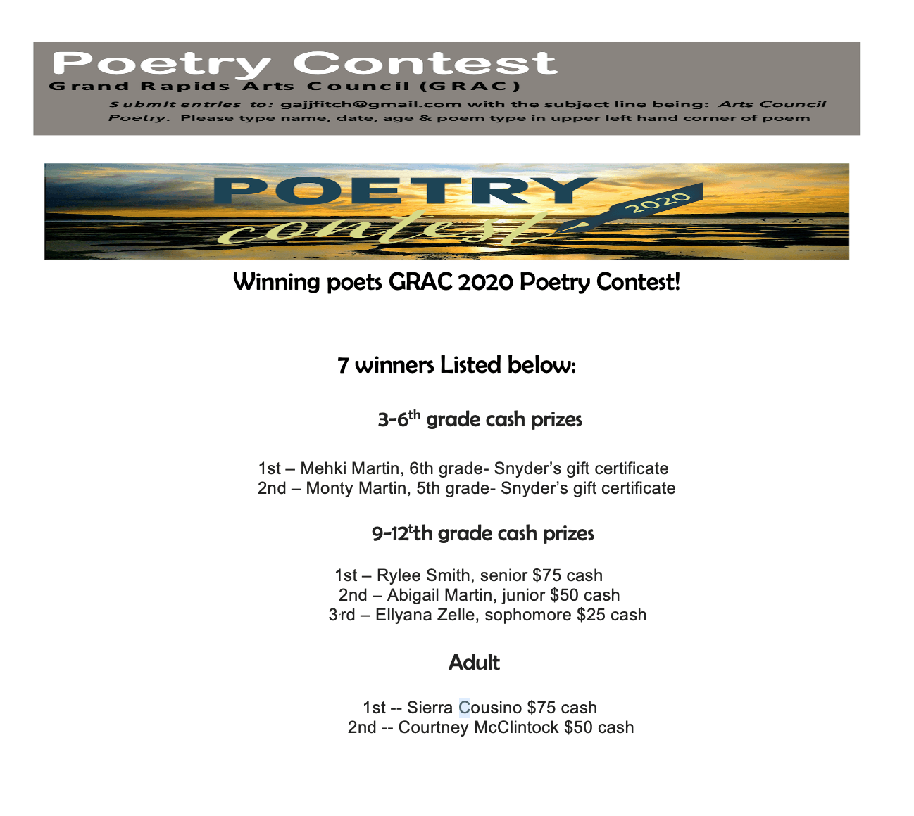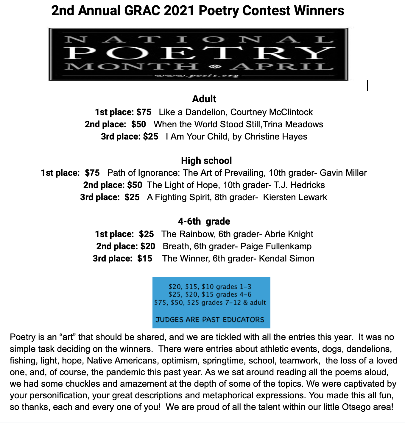 We had 60 entries 7-12th grade/adults. Congrats to our winners. Thank you to everyone who