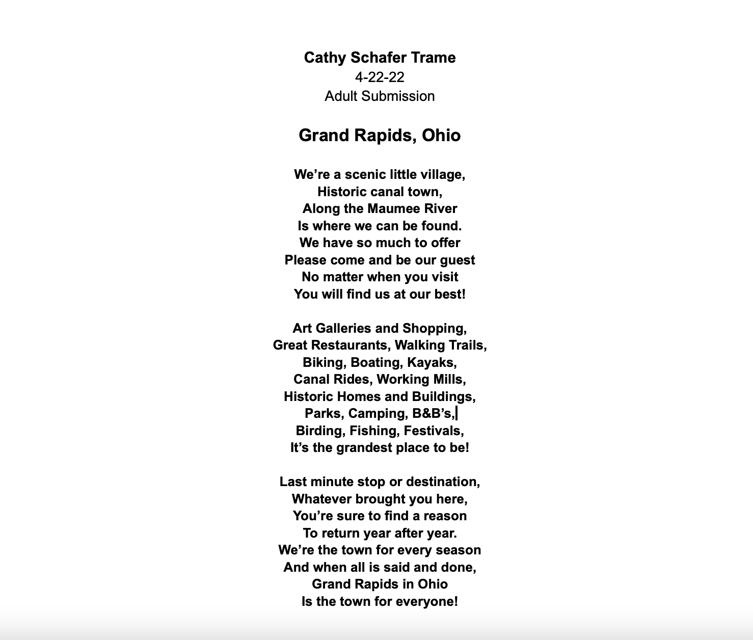 We had a great poetry reading afternoon at 3:30. It was so great hearing all the words so creatively put on the page, from 6th graders to high schoolers, and of course our adult winners. We ended our reading with a poem entitled, “Grand Rapids, Ohio”, by a local business owner.