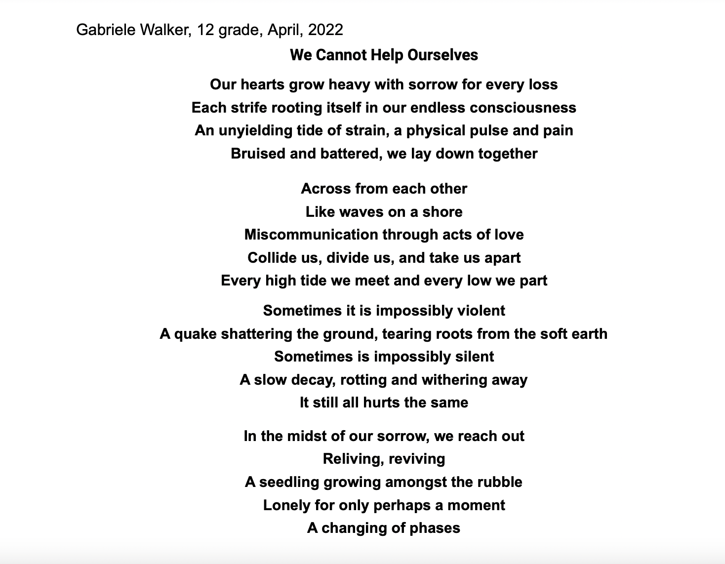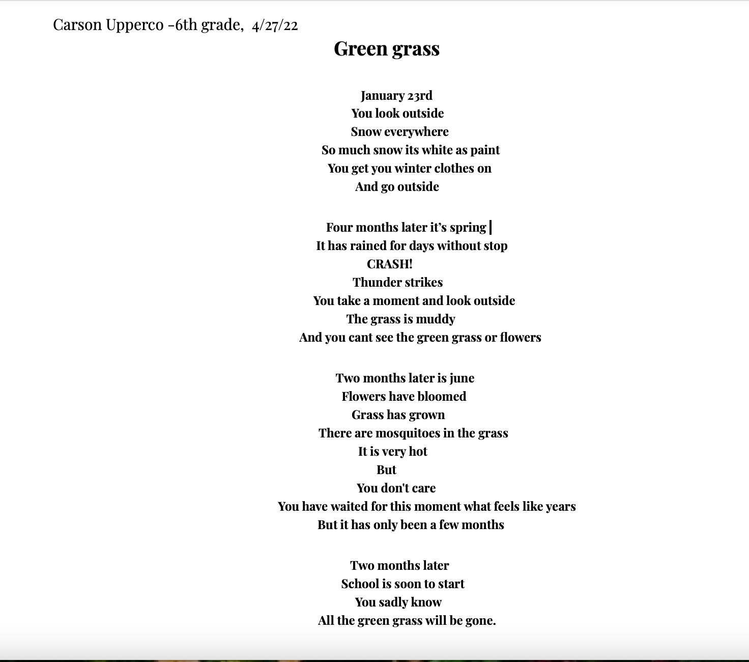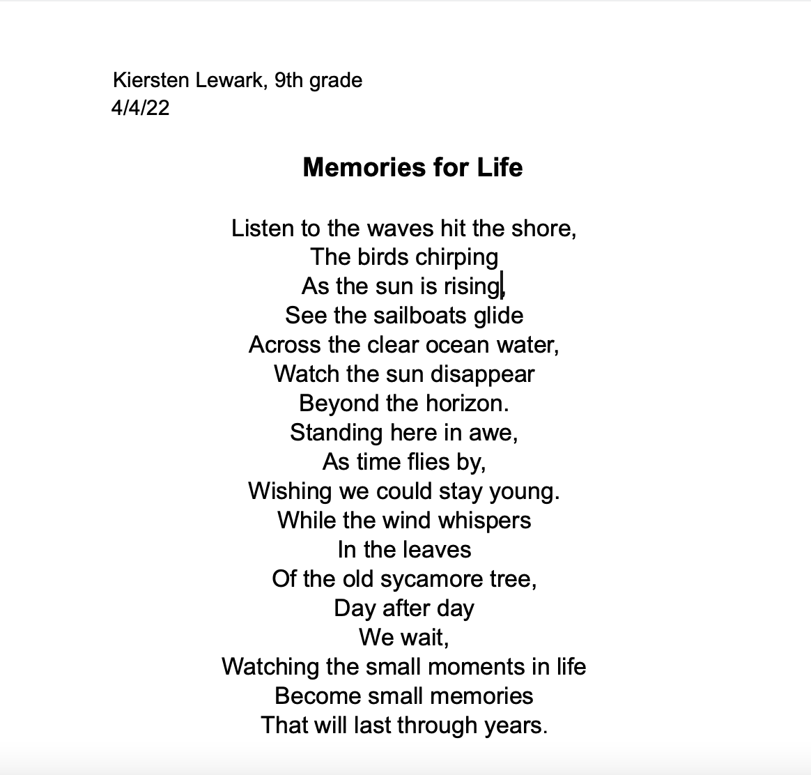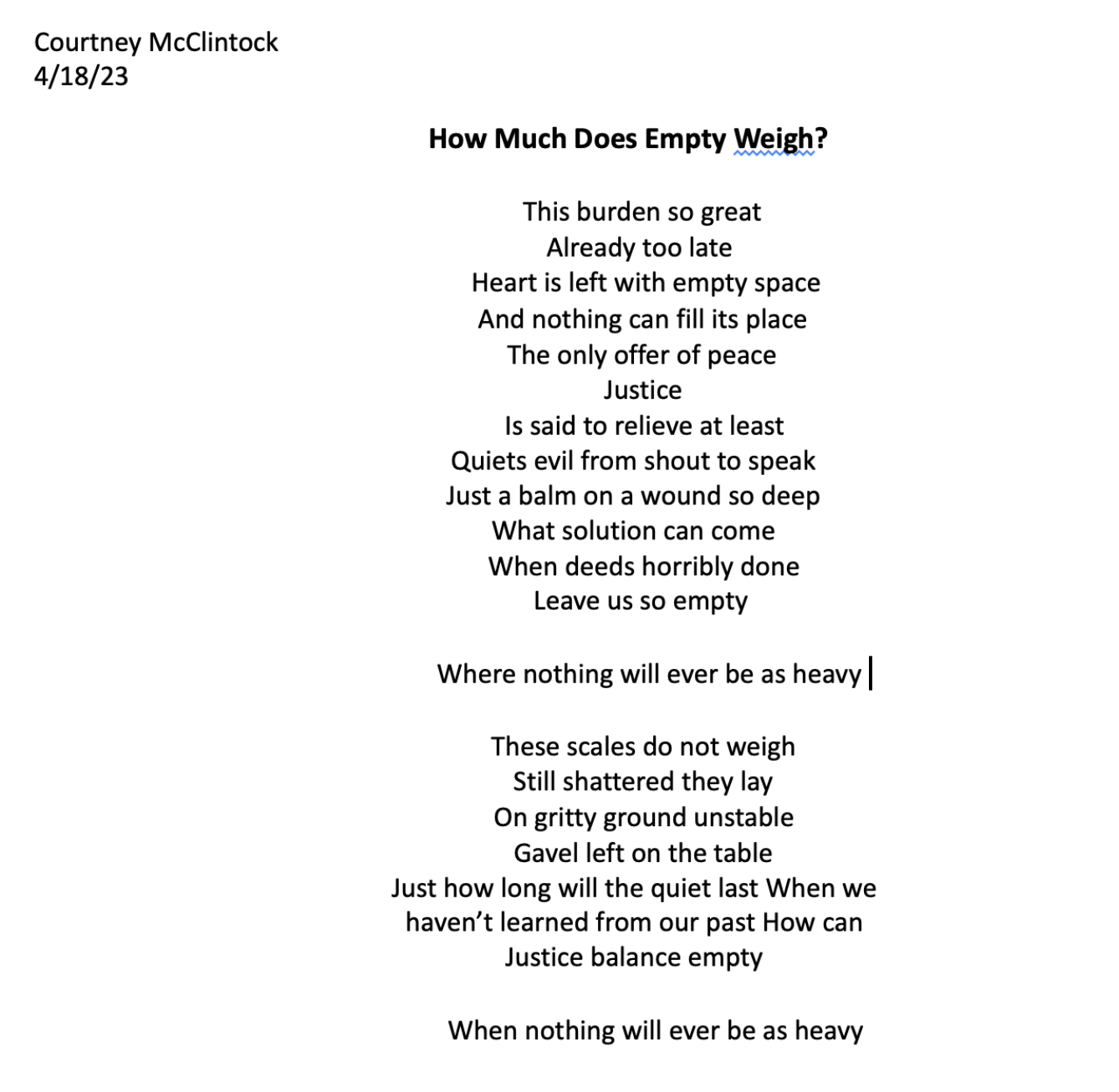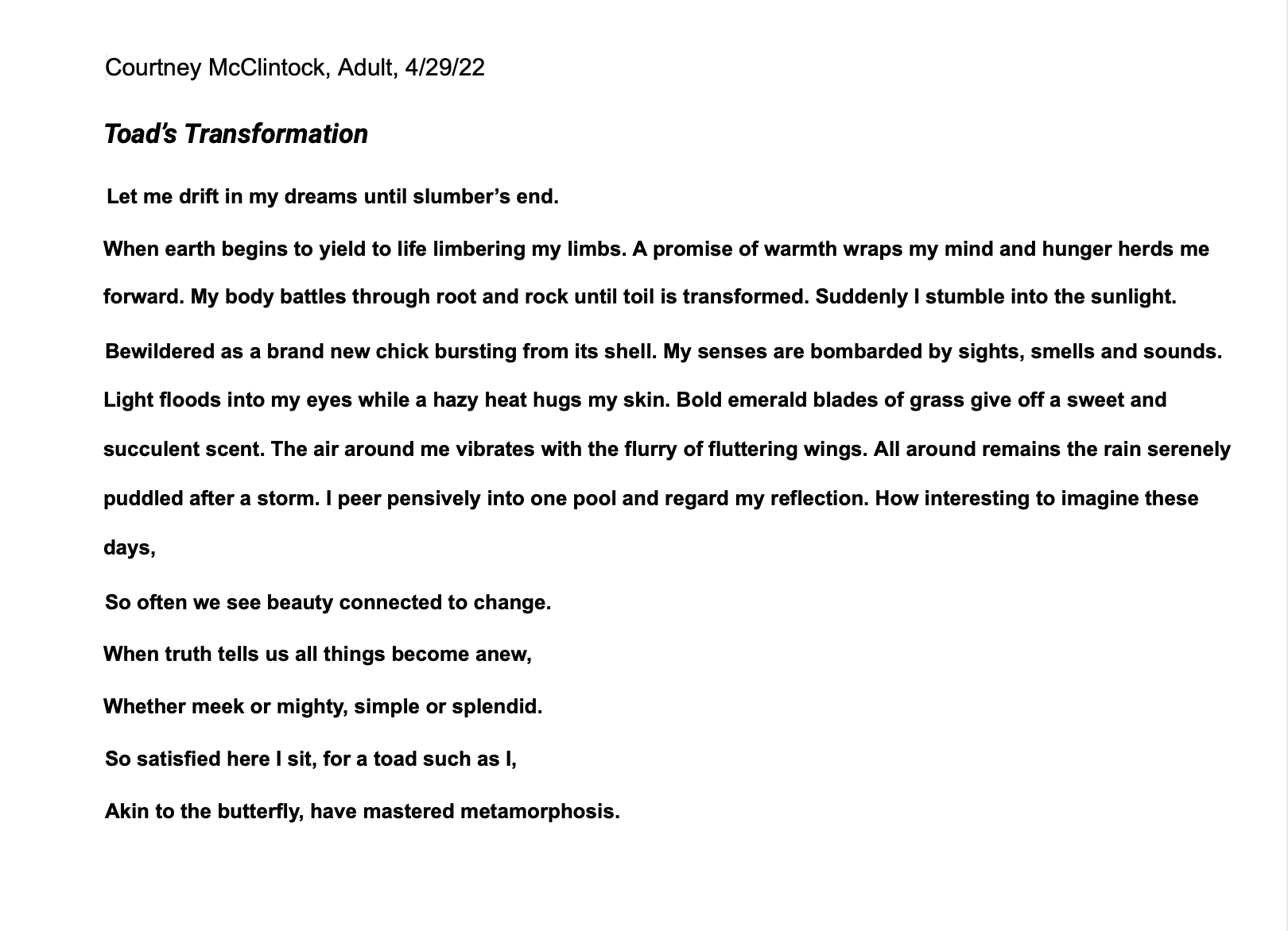 Poetry is the art of storytelling, and we had some great ones! Pictured below is our 1st place winner, Courtney McClintock. Years ago, poetry was shared on the town hall stage, so today was revisiting this great art form!